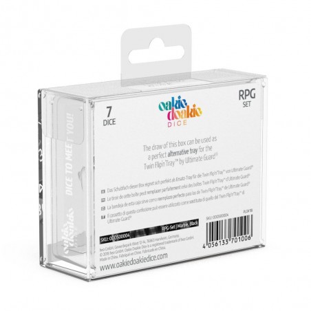 Le set Role Playing Game (jeu de rôle) est constitué de 7 dés différents D6, D4, 2x D10 (incréments de 1 et incréments de 10), D8, D20 et D12. Ils sont emballés dans une boîte rigide avec un tiroir amovible pour y accéder rapidement et jouer n'importe où.