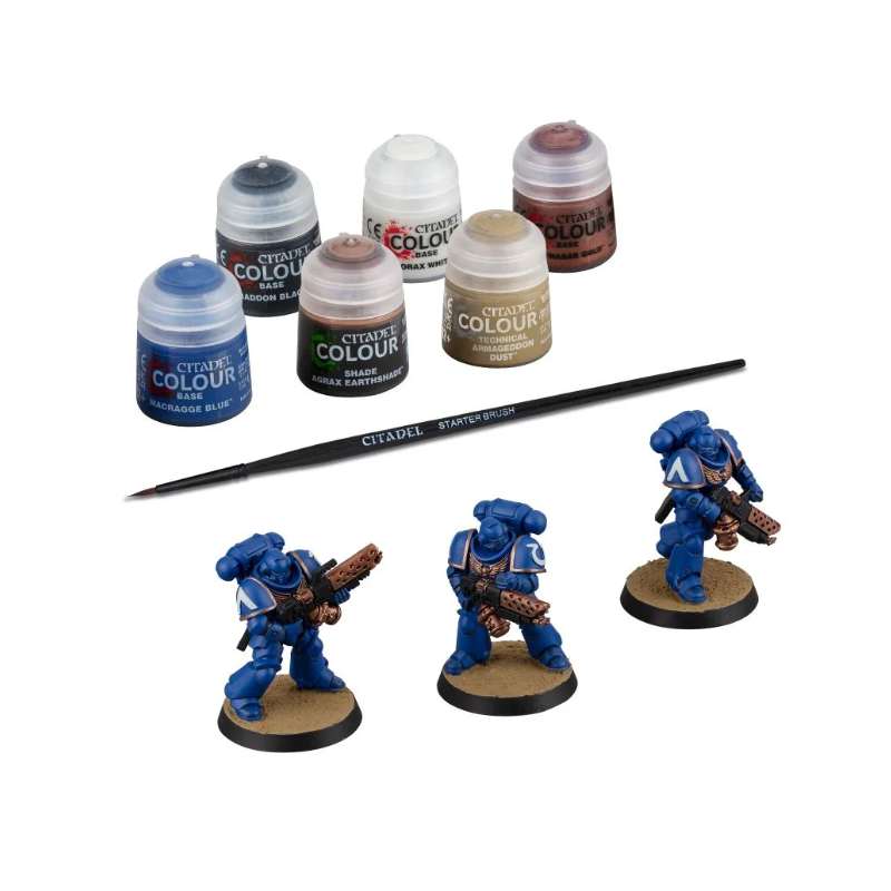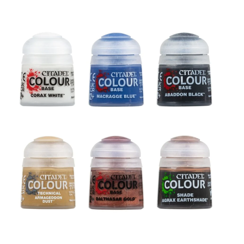 Les six peintures Citadel Colour sont fournies en pots de 12ml et proposent les principales couleurs nécessaires pour peindre ces figurines aux couleurs des Ultramarines, ainsi qu'une peinture Technical pour créer un socle texturé :