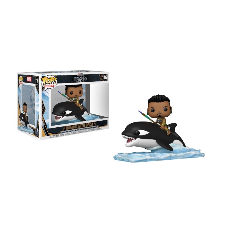 Figurine PoP Black Panther, Wakanda Forever du Roi Namor sur son orque de compagnie, qui fait aussi office d'orque de guerre, mesure environ 9cm.
