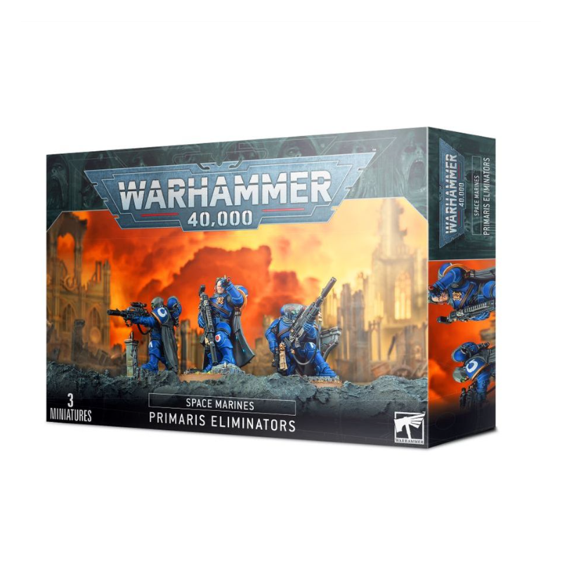 Ce kit plastique en 60 composants permet d'assembler trois Eliminators, fournis chacun avec un socle rond Citadel de 40mm. Le tout comprend en outre une planche de décalcomanies d'infanterie Space Marine Primaris.