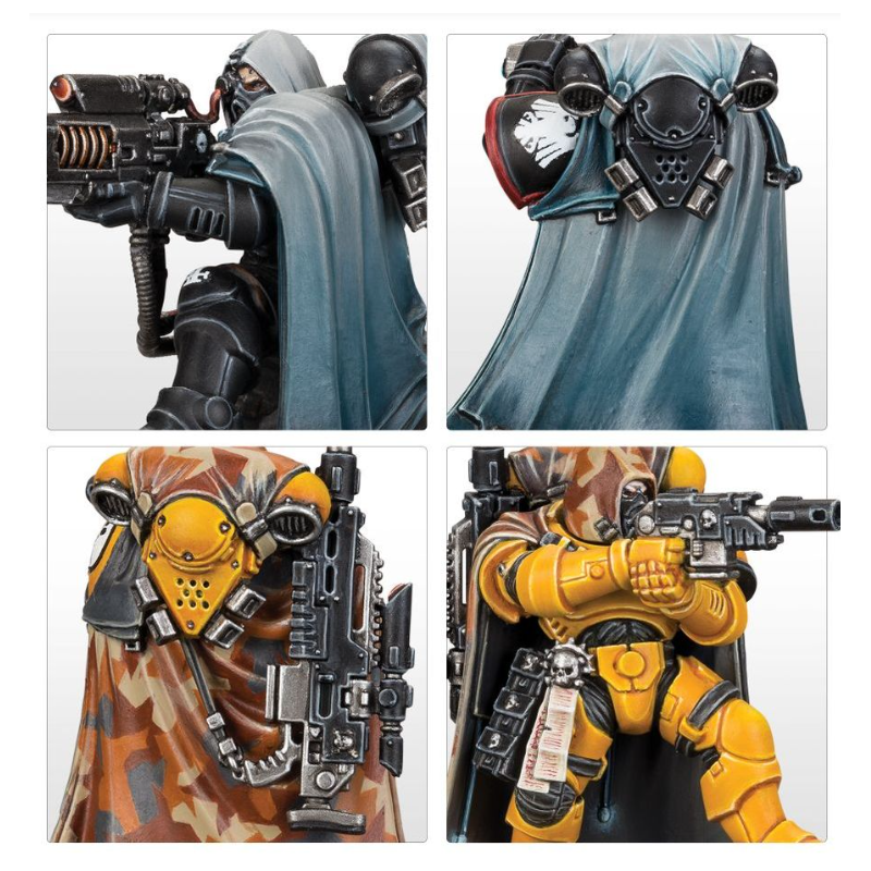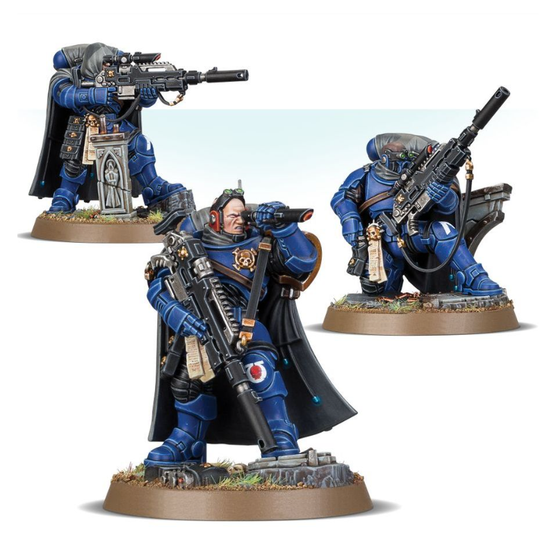 Chaque figurine de cette escouade peut être armée d'une arquebuse laser, parfaite contre les cibles les plus solides, ou d'un fusil bolter de sniper doté d'un éventail de munitions pour parer à toute éventualité. Le Sergeant peut sinon être doté d'une carabine bolter Instigator. On peut assembler les trois figurines avec ou sans casque, et le kit propose diverses pièces optionnelles qui vous permettent de rendre l'unité plus distincte.