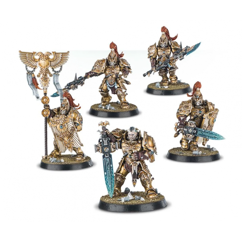 Resplendissants dans leur armure dorée, les membres de l'Adeptus Custodes partent livrer bataille avec l'assurance que leur stature imposante leur confère. Les balles et les éclats ricochent sur le plastron immaculé de ces guerriers nantis du meilleur équipement et de la bénédiction de l'Empereur en personne. Ils manient avec vivacité et vigueur leur lance de gardien, taillant l'ennemi en pièces avec une force immense ou l'abattant de loin avec le bolter intégré. L'esprit de l'Adeptus Custodes juge – et ses poings donnent la mort.