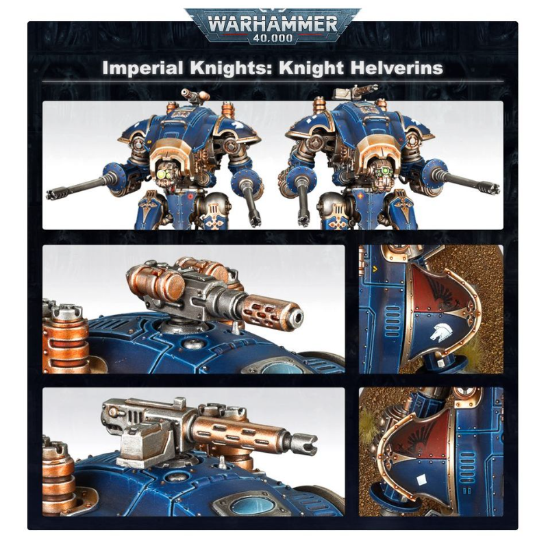 Petits et agiles par rapport à leurs cousins plus pesants, les Chevaliers de classe Armigère sont des machines de guerre incroyablement puissantes. Pilotés par de jeunes écuyers ou des pilotes de basse extraction, les Armigères servent de forces d’appui mobile et d’escorteurs pour empêcher les Chevaliers plus grands de se faire encercler, et reçoivent les ordres de leurs Nobles via le Heaume Mechanicum. Parmi ces engins véloces, les Armigères Helvériens sont des plates-formes d’armes mobiles capables de briser un assaut ennemi en quelques secondes. Grâce à leurs deux autocanons, ils délivrent des grêles de tirs pour harceler l’infanterie lourde aussi bien que les véhicules légers.