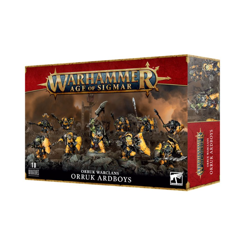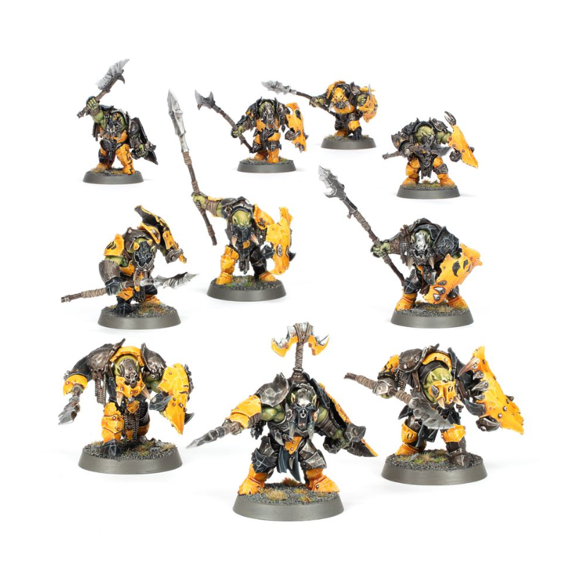Les Durboys Orruks se ruent dans la mêlée en poussant des cris déments et dans le boucan de leurs armures de plates en fonte. Ces hordes de combattants féroces et couturés de cicatrices se fraient un chemin à travers les rangs ennemis à l'aide de toutes sortes d'armes grossières mais affreusement tranchantes, repoussant les représailles et les ennemis malchanceux à coups de boucliers lourds.