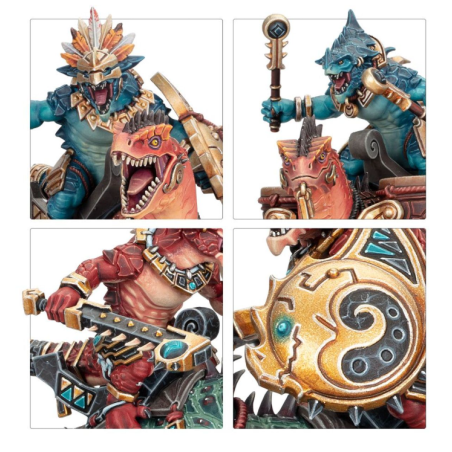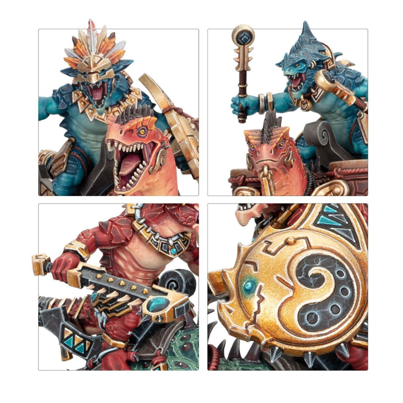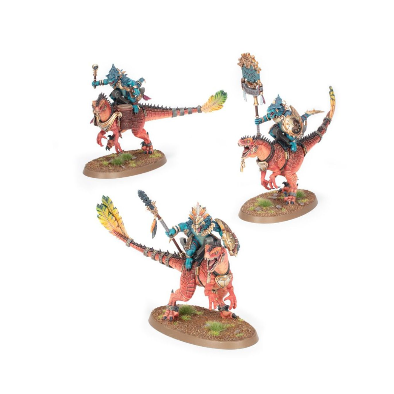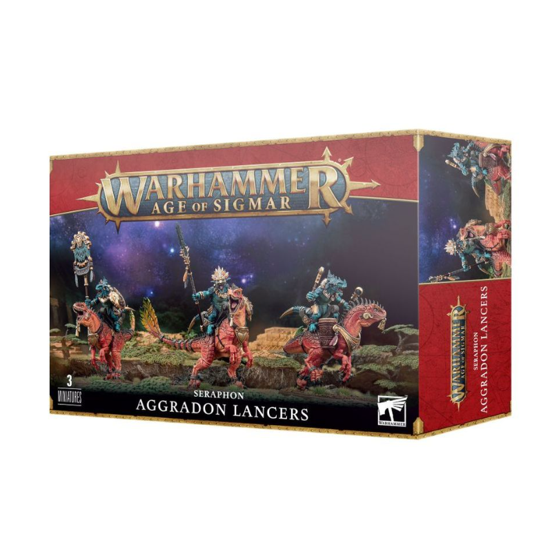 Ce kit plastique permet d'assembler trois Lanciers Aggradons, de formidables cavaliers assoiffés de sang pour les Séraphons. Les chevaucheurs saurus peuvent être équipés d'une massue de célestite barbelée ou d'une lance de célestite acérée, et ils proposent chacun deux colliers protecteurs pour vous donner le choix dans la position. Une figurine peut être assemblée comme champion Alpha, avec un choix de têtes et d'armes uniques, des positions de bras différentes et un bouclier unique. Une autre peut être assemblée comme musicien Tambour de Guerre, et une autre comme Porte-icône.