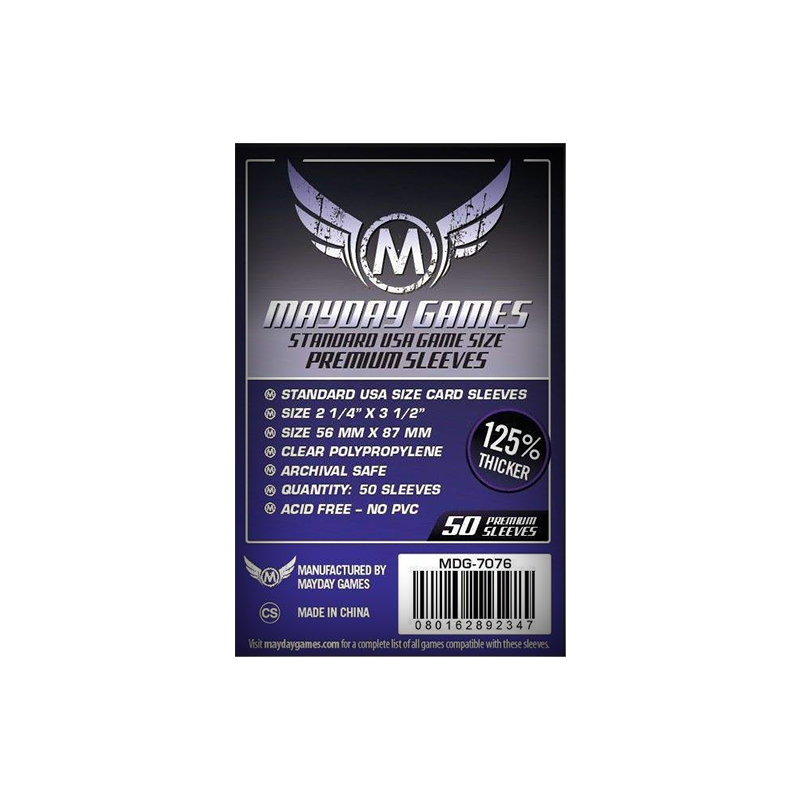 Paquets de 50 sleeves premium transparent format 56x87 mm. Idéal pour protéger vos jeux de société.