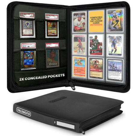 Il peut contenir 216 cartes, dispose de 4 pochettes pour accessoires, d'un compartiment pour traqueur, et est conçu pour les cartes Toploader.
