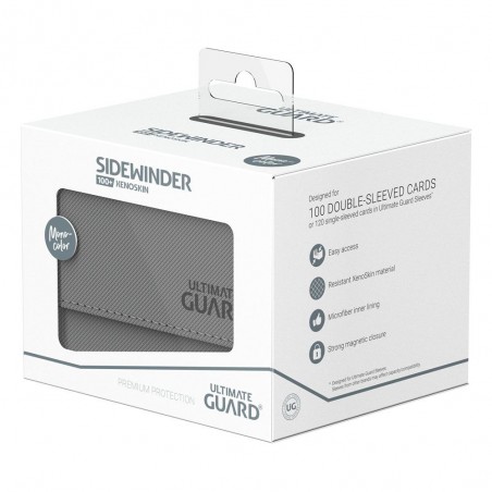 La boîte pratique Sidewinder 100+ permet d'accéder facilement à votre deck des deux côtés. Elle est optimisée pour contenir 100 cartes en double-sleeve ou 120 cartes en simple-sleeve de taille standard dans des pochettes Ultimate Guard.