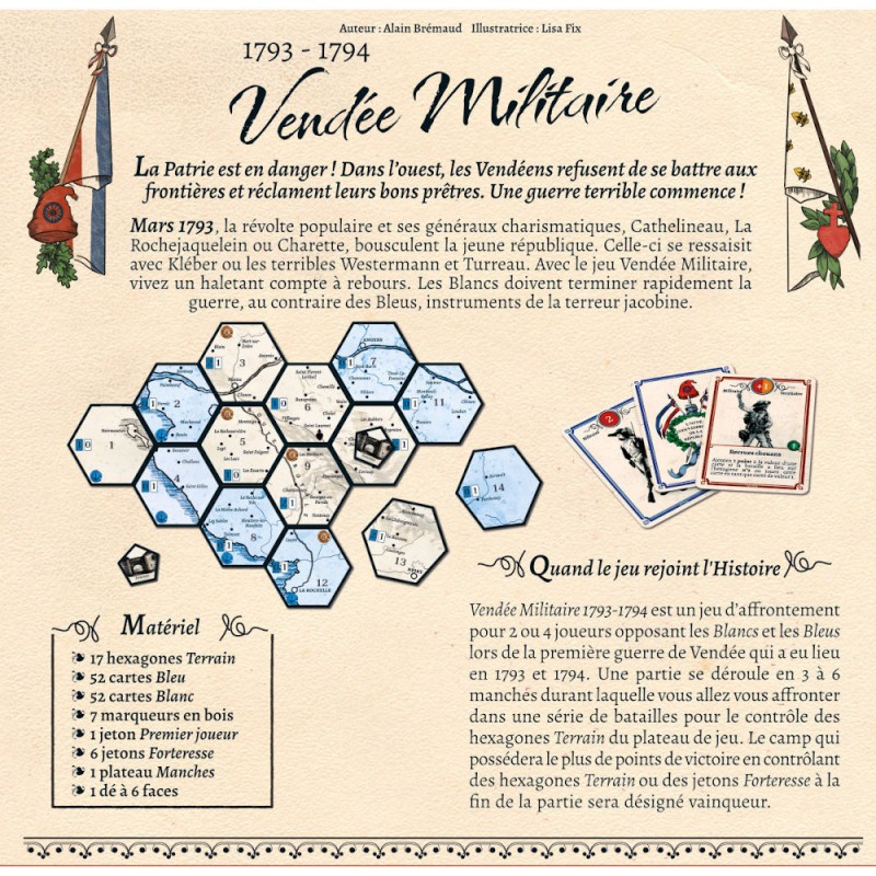 Dans l’ouest, les Vendéens refusent de se battre aux frontières et réclament leurs bons prêtres. Une guerre terrible commence ! Mars 1793, la révolte populaire et ses généraux charismatiques, Cathelineau, La Rochejaquelein ou Charette, bousculent la jeune république. Celle-ci se ressaisit avec Kléber ou les terribles Westermann et Turreau. Avec le jeu Vendée Militaire, vivez un haletant compte à rebours. Les Blancs doivent terminer rapidement la guerre, au contraire des Bleus, instruments de la terreur jacobine.