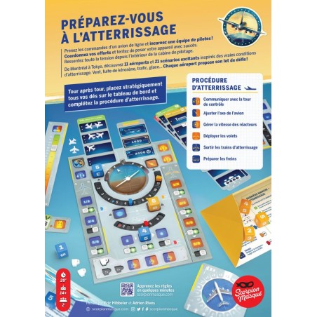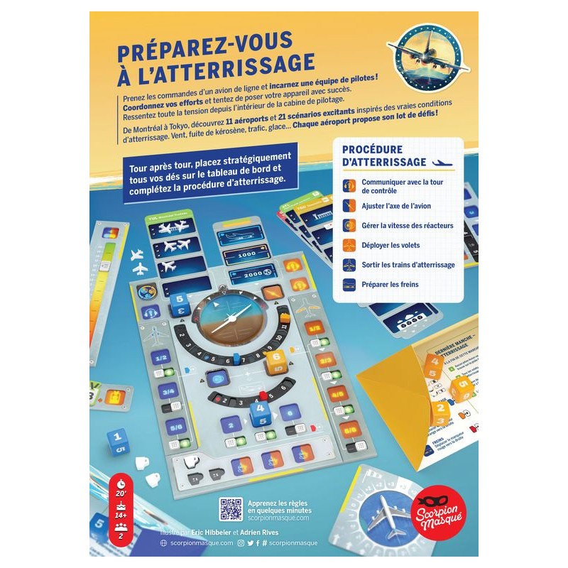Pour rejoindre la terre ferme, les joueurs devront surveillez l'axe de l'avion, contrôler sa vitesse, déployer les volets, sortir le train d'atterrissage, contacter la tour de contrôle afin de réguler la circulation aérienne, et éventuellement, prendre un petit café pour améliorer leur concentration et modifier la valeur de leur dés.