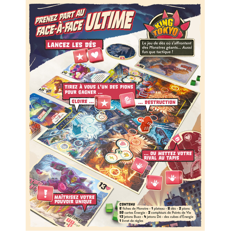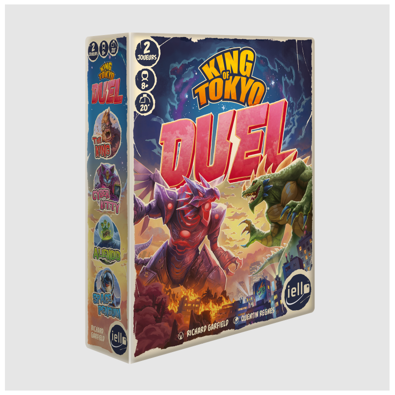 King of Tokyo: Duel est la version ultime pour deux joueurs du célèbre jeu de Richard Garfield, où chaque lancer de dés compte pour dominer Tokyo. Dans cette édition, les monstres emblématiques s'affrontent dans une bataille épique, alliant stratégie, audace et chance. Préparez-vous à un duel sans merci, où chaque lancer de dés et chaque carte jouée peut vous rapprocher de la victoire… ou de la défaite. King of Tokyo: Duel est le jeu parfait pour ceux qui aiment les affrontements stratégiques intenses sans perdre l'amusement, l'efficacité et l'authenticité de King of Tokyo !