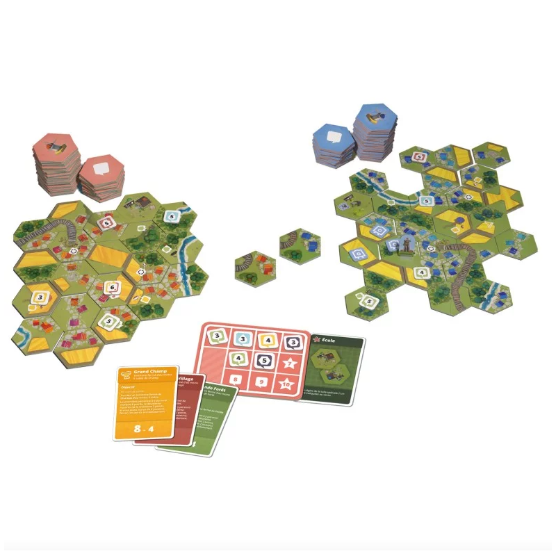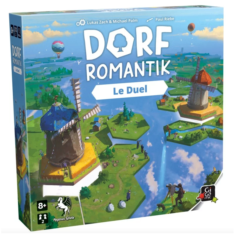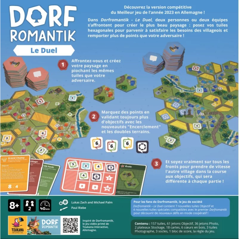 Dans Dorfromantik – Le Duel, deux joueurs ou deux équipes s’affrontent pour créer le plus beau paysage de tuiles hexagonales. Qui d’entre vous parviendra le mieux à satisfaire les besoins des villageois et à remplir les nouveaux types d’objectifs fournis dans cette édition ? Deux modules supplémentaires optionnels viennent ajouter des défis inédits et une interaction plus prononcée. À vous de jouer !