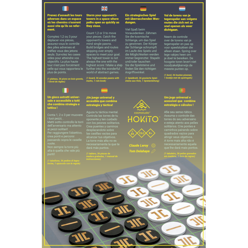 Pour gagner à Hokito, comptabilisez plus de points que votre adversaire, en créant des piles. Les déplacements se font de 1, 2 ou 3 cases en fonction de la valeur du jeton que vous déplacez. Cherchez les raccourcis cachés pour déjouer la stratégie de votre adversaire.