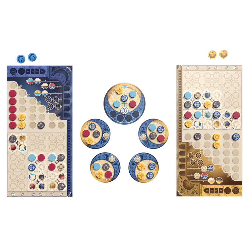 Choisissez toutes les tuiles d’une même couleur depuis un cercle de fabrique de jour, ou depuis l’ensemble des fabriques côté nuit ! Posez un motif Dôme pour qu’il corresponde à vos lignes de plafond, afin de marquer le plus de points possible. Remplissez les objectifs pour faire la différence.