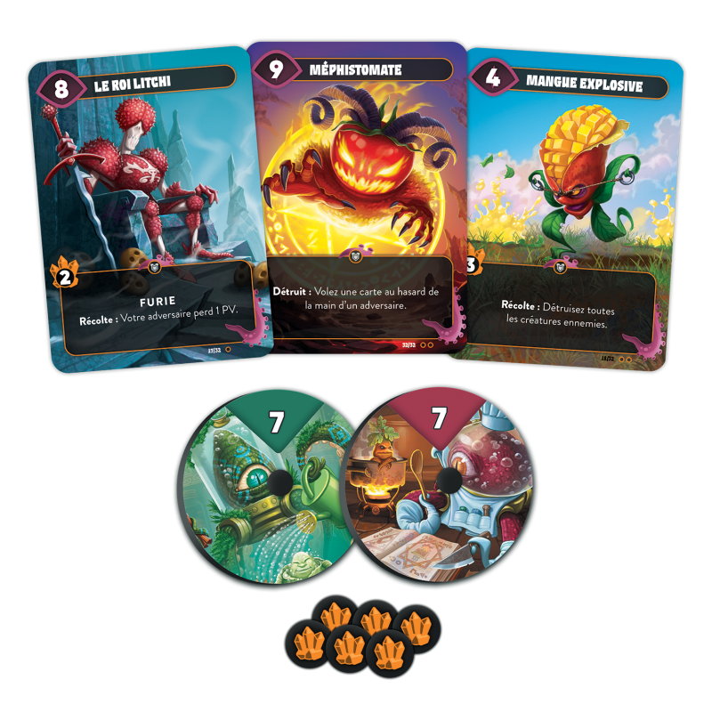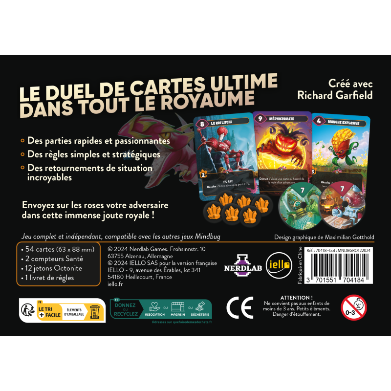 Mindbug : Bataille de Fruits Royale est un jeu standalone dans l’univers Mindbug qui s’inscrit dans la tumultueuse histoire d’un royaume d’ananas paladins luttant contre le puissant roi litchi. Plantez vos créatures fruits et légumes, protégez-les de vos adversaires et récoltez leurs folles capacités. Et comme toujours, même s’il est un standalone, Mindbug : Bataille de Fruits Royale peut être joué de manière indépendante ou associé avec d’autres jeux Mindbug.