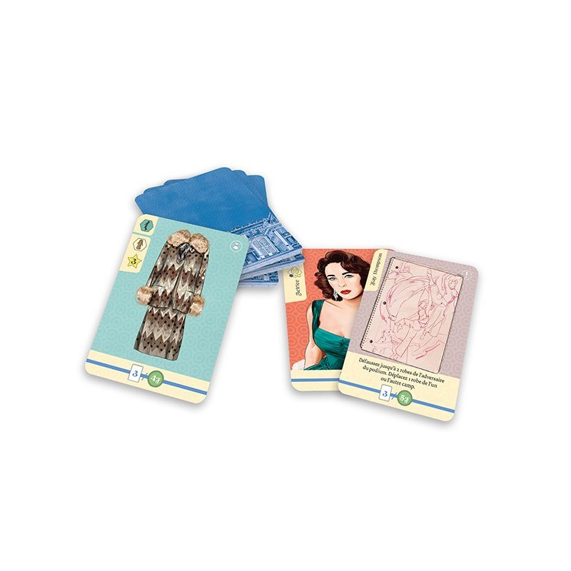 Jouez les actions des tuiles où s’arrête la mannequin sur le podium. Piochez des cartes et jouez-les. Les robes vous apportent des points de prestige et peuvent activer les effets de vos couturiers. Ils améliorent vos effets de tuiles et mitigent ceux de l’adversaire. C’est là que tout le tir à la corde se joue : la mannequin arpente cinq fois le podium, tentant d’attirer les lumières à elle !