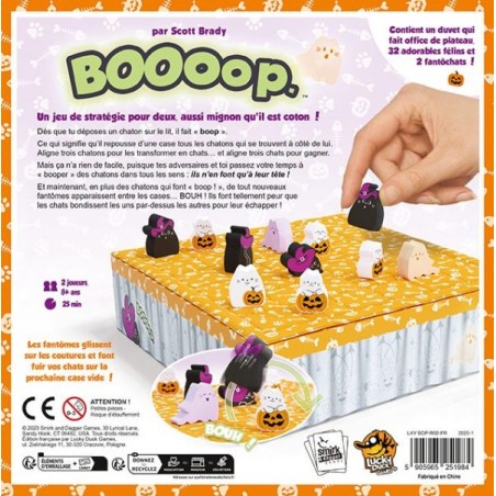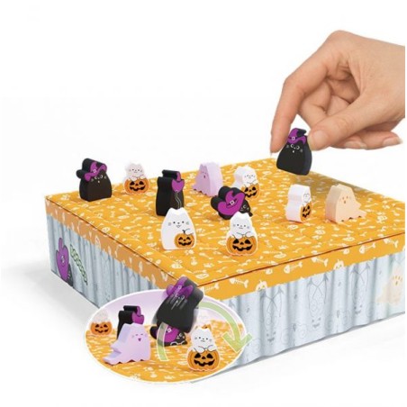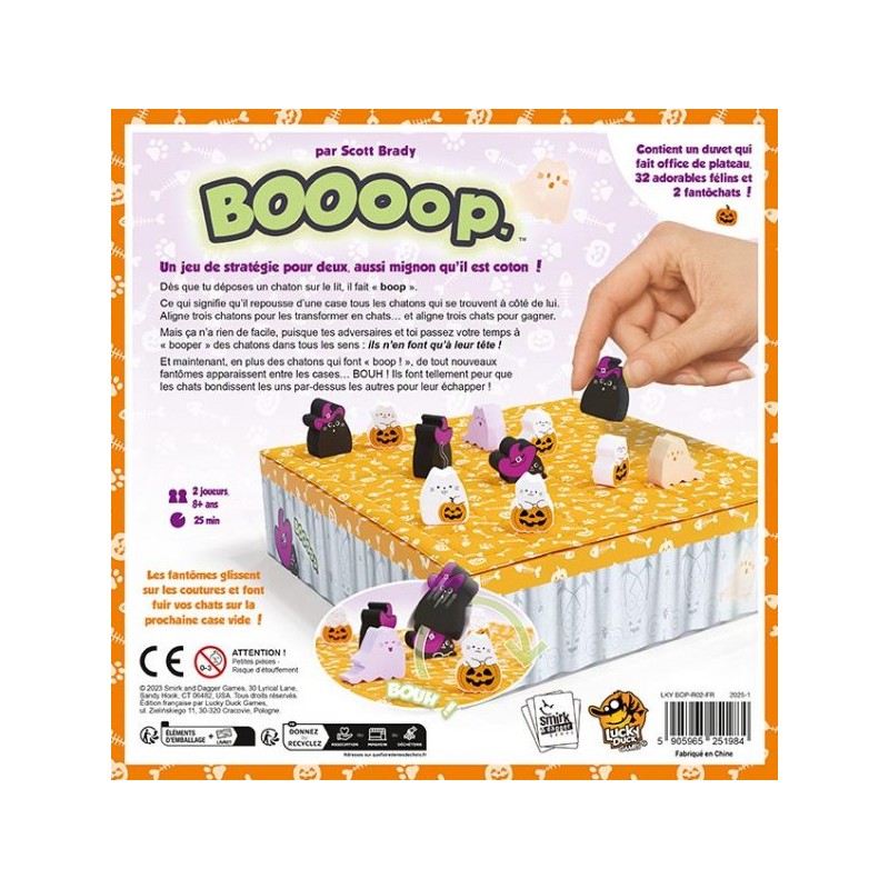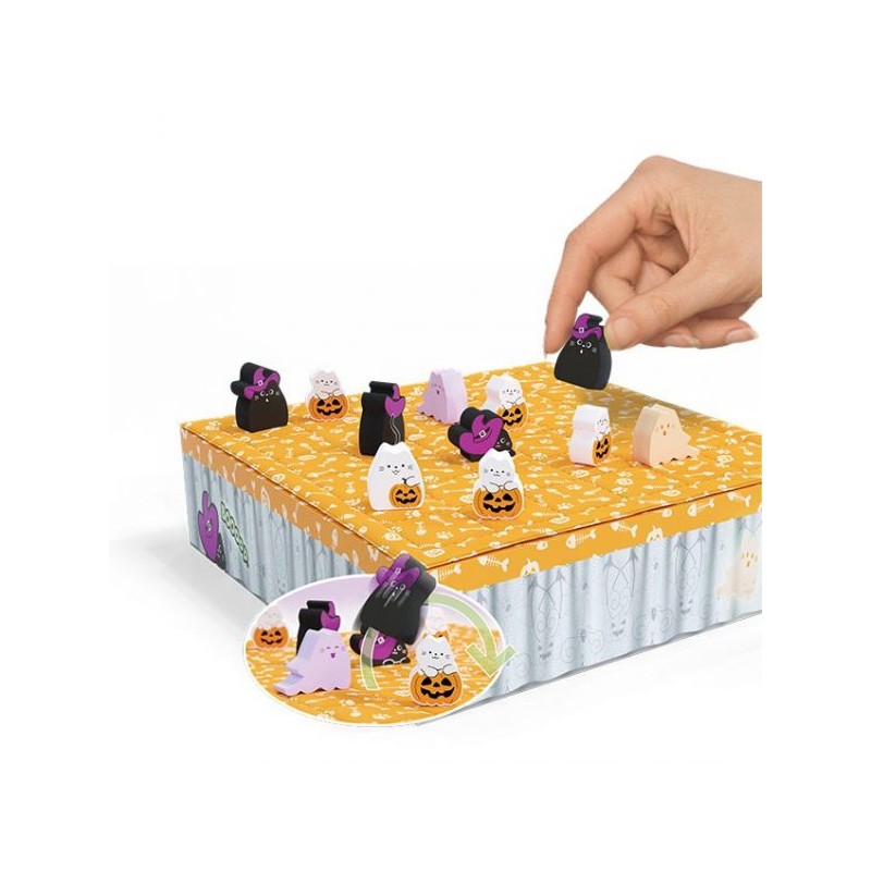 Mais ça n’a rien de facile, puisque tes adversaires et toi passez votre temps à « booper » des chatons dans tous les sens : ils n’en font qu’à leur tête ! Et maintenant, en plus des chatons qui font « boop ! », de tout nouveaux fantômes apparaissent entre les cases … BOUH ! Ils font tellement peur que les chats bondissent les uns par-dessus les autres pour leur échapper !