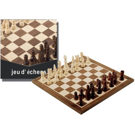 Le plateau est en bois marqueté. Un très joli ensemble pour un cadeau. Un jeu traditionnel à offrir pour partager le plaisir du jeu d'échec. Pions de jeux en bois marrons et naturels.