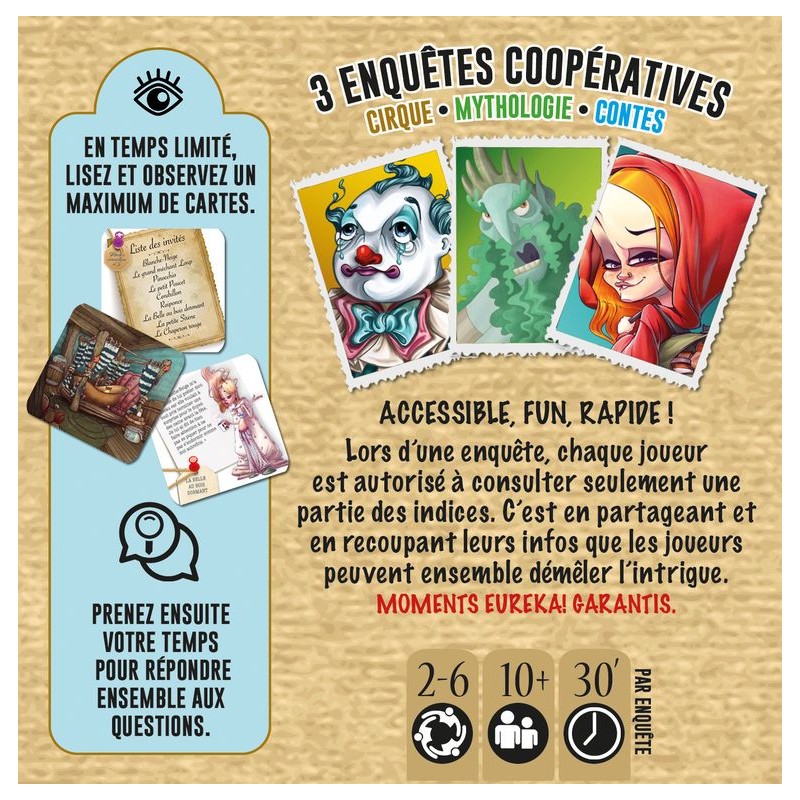 La mécanique de jeu est très simple et se résume en 2 phases : pour chaque enquête, d'abord les joueurs lisent et observent un maximum de cartes dans un temps limité. Puis ils prennent ensemble le temps nécessaire pour partager et recouper leurs infos afin de répondre à une série de questions autour de l'intrigue. Plus ils accumulent les bonnes réponses, plus ils accèdent à un rang d'enquêteur élevé !