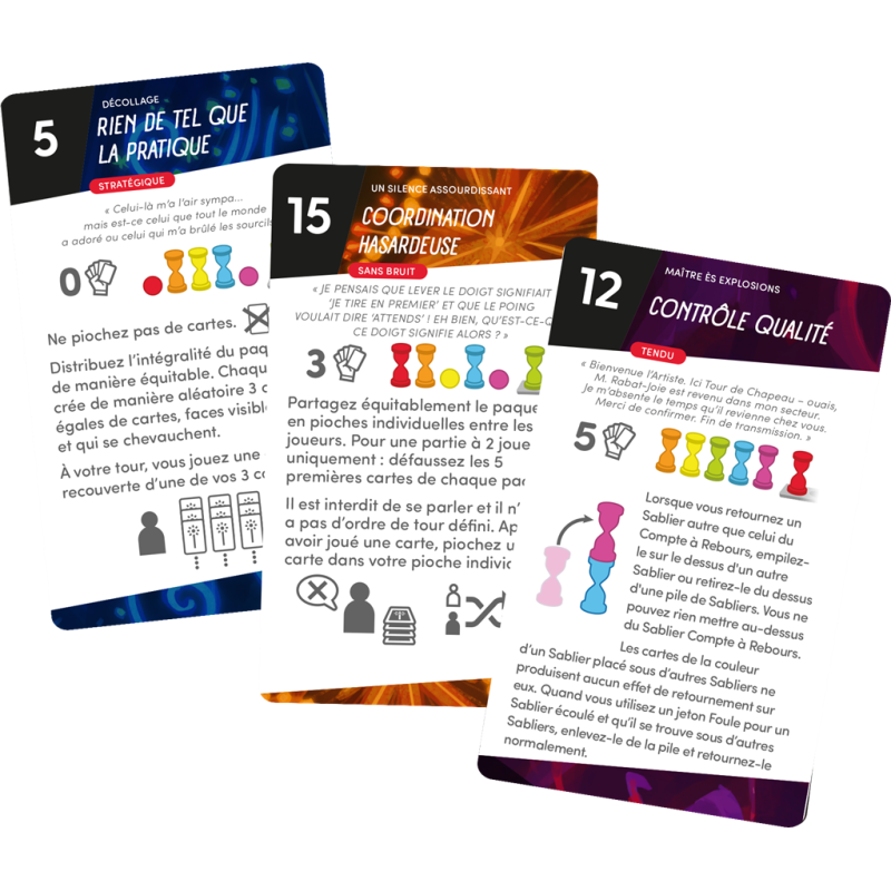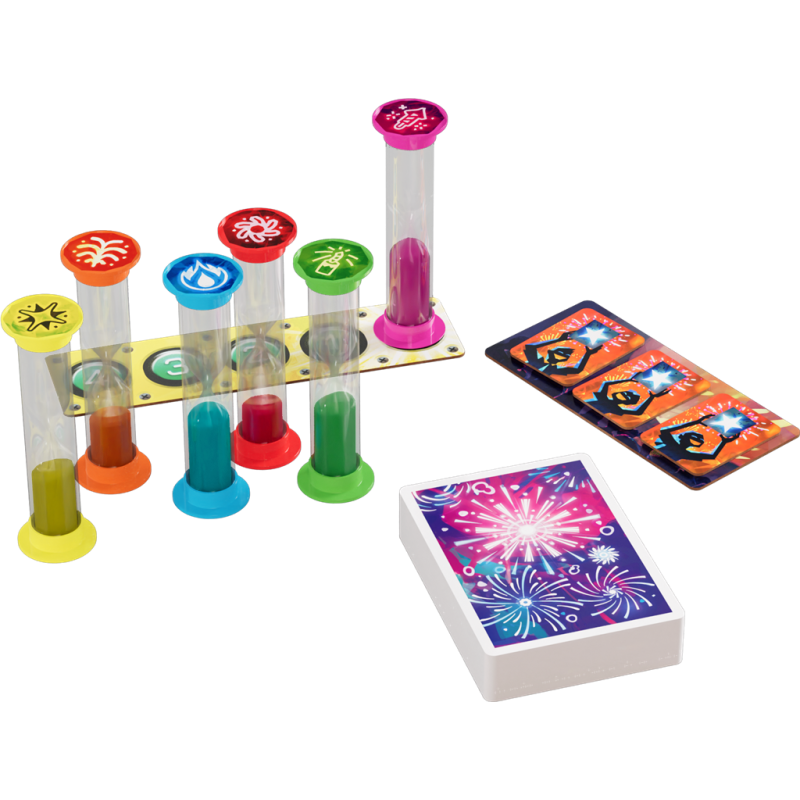 Choisissez l’un des 30 défis ou jouez en festival (3 défis de suite), chaque défi propose des règles spéciales pour renouveler le plaisir. Placez les sabliers de couleur dans la configuration de départ, indiquée par le défi, piochez des cartes Feux d’artifice et c’est parti. Chacun leur tour, les joueurs jouent une carte et retournent les sabliers correspondant aux 2 couleurs indiquées. Mais attention, si un sablier de couleur se vide, le public commence à déserter. Au troisième, vous perdez la partie. Mais pour le sablier « compte à rebours » la règle est inverse, vous ne pouvez le retourner que s’il est vide et ce faisant le faire progresser vers la fin du festival. Maintenez à flot tous les autres sabliers pendant que vous laissez le compte à rebours se vider 5 fois, et vous gagnez la partie !