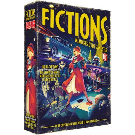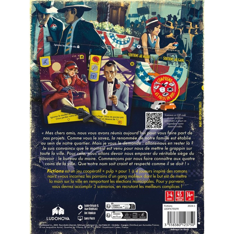 Fictions est un jeu coopératif « pulp » pour 1 à 4 joueurs inspiré des romans noirs : vous incarnez les parrains d’un gang mafieux dont le but est de mettre la main sur la ville en remportant les élections municipales. Vous devrez d’abord terminer deux scénarios afin d’obtenir assez de réputation pour que les Complices les plus craints de la ville rejoignent vos rangs et vous aident à concrétiser vos plans pleins d’ambition. Chaque scénario possède ses propres règles expliquées dans le Livret de scénarios et résumées sur une carte Aide de jeu.