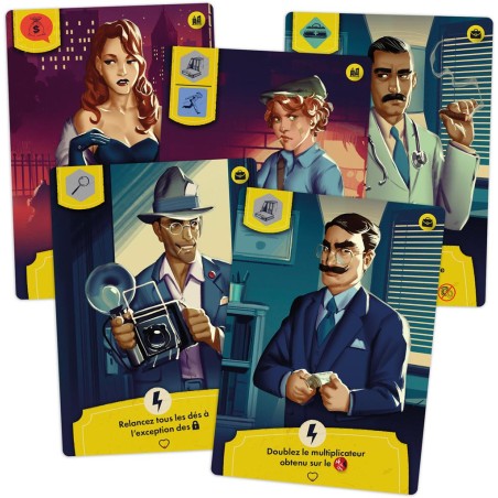 À votre tour, recrutez des complices en tirant de nouvelles cartes ou résolvez une carte Problème. Pour cela, jouez des cartes Complices dotés des talents et compétences adéquates et lancez les dés qu’ils vous octroient. Pour réussir, vous devez obtenir le nombre de succès demandé.