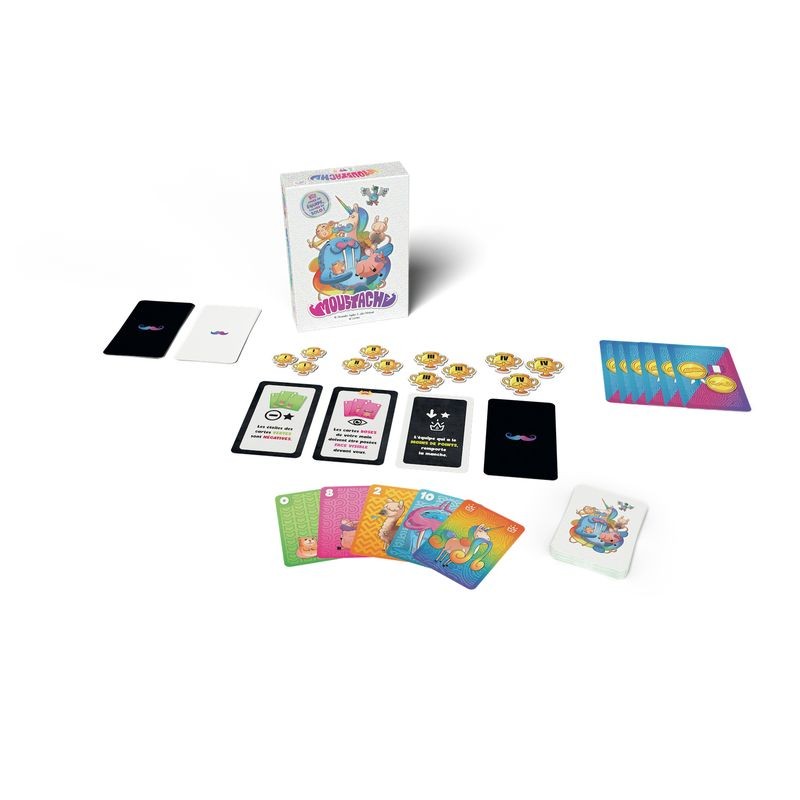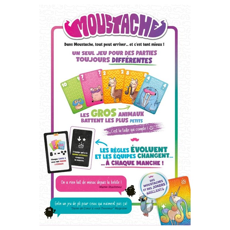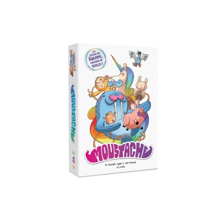 Moustache est un jeu de plis à rebondissements, pour 3 à 6 joueurs. À chaque manche, les équipes sont redéfinies aléatoirement et une nouvelle règle vient chambouler la partie : hiérarchie des couleurs inversée, jokers délirants, effets de cartes... Rien n’est jamais figé ! Grâce à un système de règles évolutives et de cartes Équipe, chaque partie est unique et pousse à l’adaptation constante. On y retrouve le plaisir immédiat du jeu de plis, enrichi d’un goût de chaos contrôlé. Facile à apprendre, drôle à jouer, idéal pour animer une soirée famille ou amis.