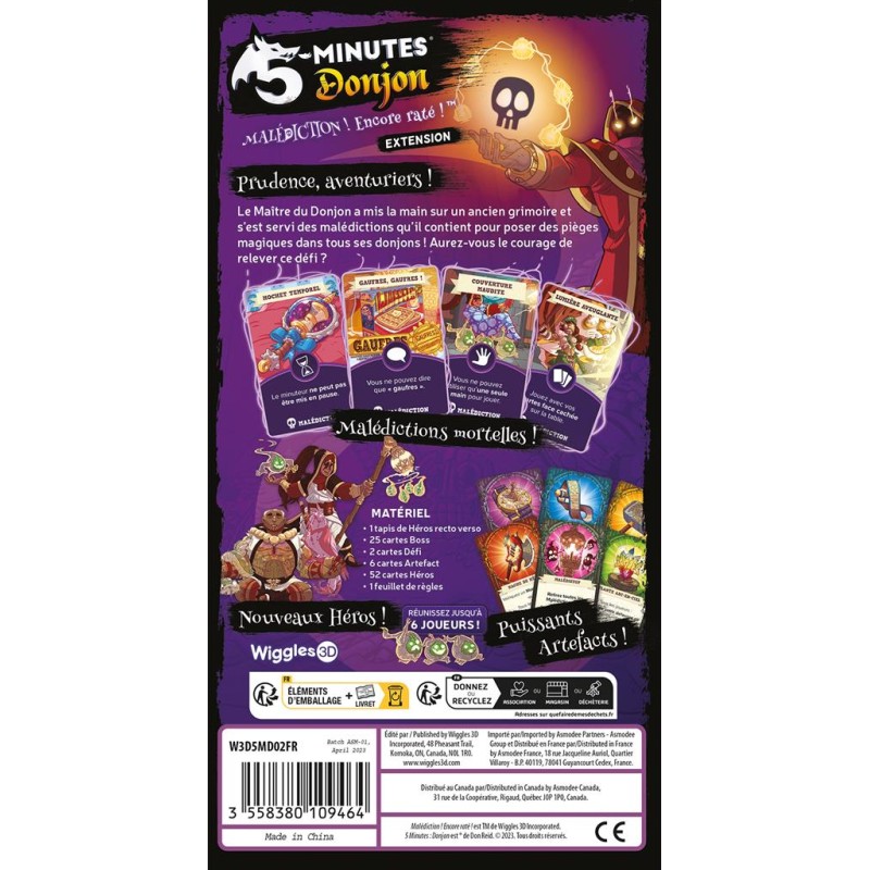 Malédiction ! Encore raté ! est une extension pour 5 Minutes : Donjon qui ajoute des cartes Boss au Donjon, deux nouveaux personnages (la Druidesse et le Shaman), ainsi que de puissants Artefacts pour aider l’équipe à surmonter des situations délicates.