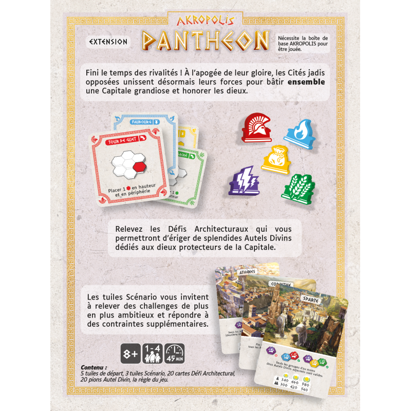 Après Akropolis et Akropolis Athéna, découvrez une nouvelle façon de bâtir avec Akropolis Pantheon, une extension 100% coopérative. Les joueurs ne cherchent plus à rivaliser, mais à s’allier pour ériger la plus grande et la plus harmonieuse des Capitales. Chaque décision compte : posez judicieusement vos tuiles, coordonnez vos choix et optimisez vos quartiers pour atteindre ensemble les objectifs communs imposés par les dieux de l’Olympe. La gloire n’appartiendra plus à un seul, mais à toute la communauté de bâtisseurs ! Points forts :
