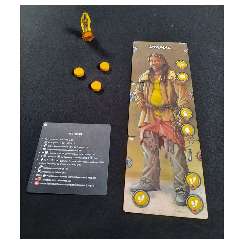 Un pion sablier parcourt cette ligne de temps pour activer les cartes ajoutées par vos actions et c'est le cœur du jeu : le scénario est écrit mais le jeu réagit à ce que vous faites pour déclencher une réaction en chaine d'évènements. L'idée est de se rapprocher d'une narration forte inspirée du cinéma ou des séries TV pour favoriser l'immersion.