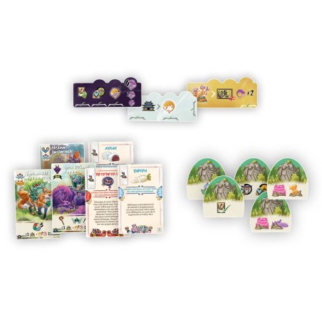 L'Auberge du Cave de la forêt a le plaisir de vous proposer ses trois menus afin d'agrémenter vos parties de Bitoku. Et il y en a pour tous les goûts : collation rapide ou repas copieux, vous pourrez même engloutir tout le buffet en une seule fois si l'appétit vous en dit. Grâce à cette boîte et son contenu additionnel comprenant des cartes Yokai inédites, des tuiles Rocher d'Iwakura et Trésor du lac surprenantes, ainsi que toute une myriade de cartes Festival aux effets inattendus, donnez à vos prochaines parties une toute nouvelle saveur !