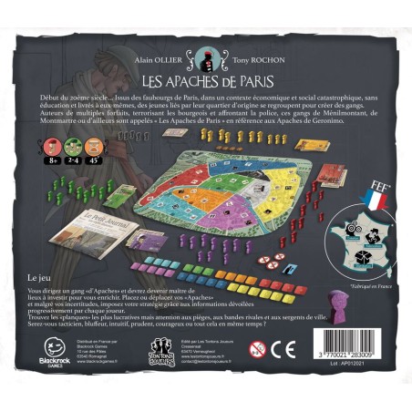 Vous dirigez un gang « d’Apaches » et devez devenir maître de lieux pour vous enrichir. Placez ou déplacez vos Apaches et malgré vos incertitudes, imposez votre stratégie grâce aux informations dévoilées progressivement par chaque joueur. Trouvez les « planques » les plus lucratives mais attention aux pièges, aux bandes rivales et aux sergents de ville. Serez-vous tacticien, bluffeur, intuitif, prudent, courageux ou tout cela en même temps ?