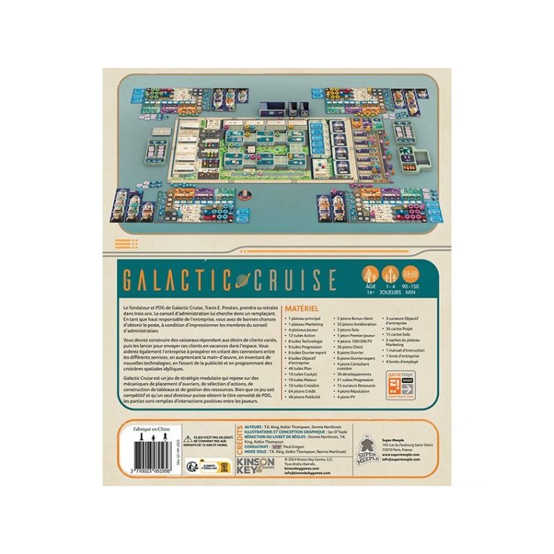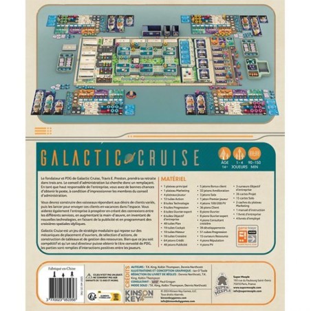 Galactic Cruise est un jeu de stratégie modulaire qui repose sur des mécaniques de placement d’ouvriers, de sélection d’actions, de construction de tableaux et de gestion des ressources. Bien que ce jeu soit compétitif et qu’un seul directeur puisse obtenir le titre convoité de PDG, les parties sont remplies d’interactions positives entre les joueurs.