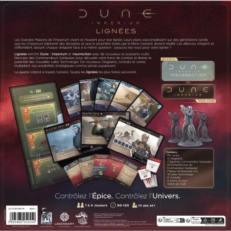 Lignées enrichit à la fois Dune : Imperium et Insurrection avec de nouveaux outils puissants pour remporter la victoire. Recrutez des commandants Sardaukar pour renforcer votre force de combat. Libérez le potentiel des toutes nouvelles tuiles Tech. Les nouveaux leaders, contrats et cartes ouvrent plus de possibilités stratégiques que jamais. La guerre ravage l’univers et seules les lignées les plus puissantes survivront.