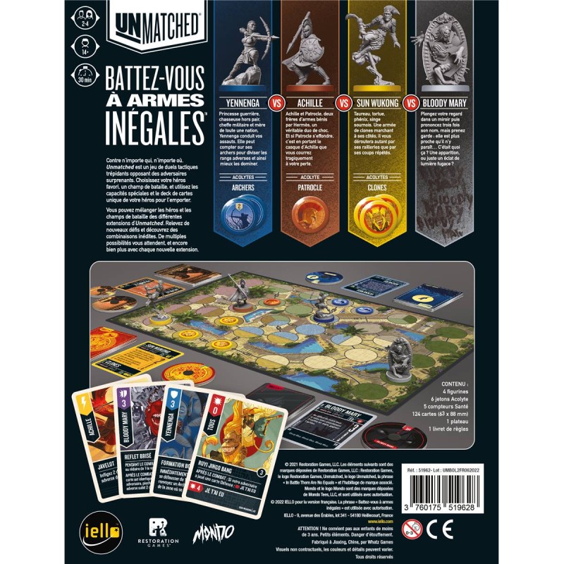 Avec ses quatre personnages emblématiques et son plateau de jeu recto verso, Unmatched propose des sensations de jeu uniques permettant de vivre l’intensité du jeu d’escarmouche sur un format bien plus compact et accessible. Proposant un fun immédiat et permettant de découvrir les capacités des héros au fil des batailles, Unmatched génère des parties ultra intenses et toujours variées.