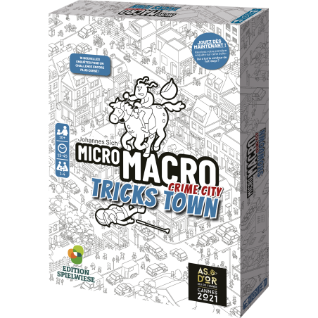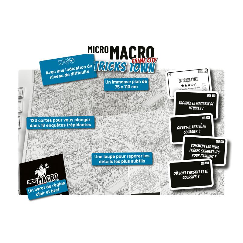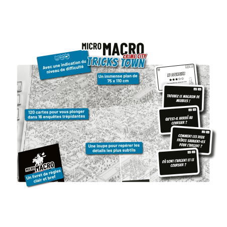 Tricks Town est le troisième volet de la série MicroMacro. Venez y découvrir une nouvelle partie de la ville, avec ses 16 enquêtes inédites et plus corsées à mener. Ce jeu est indépendant des premiers volets : il n‘est pas nécessaire de posséder ou d‘avoir joué aux épisodes précédents pour vous lancer dans ces nouvelles affaires !
