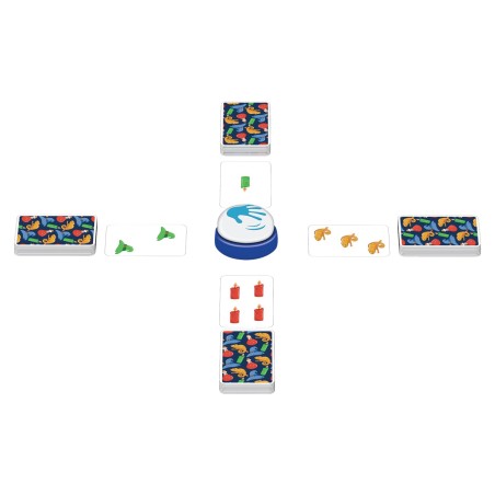 Dans Halli Galli Magic Twist, retournez vos cartes chacun votre tour, et soyez le plus rapide à taper sur la sonnette dès qu'exactement 5 symboles ou 5 couleurs identiques apparaissent.