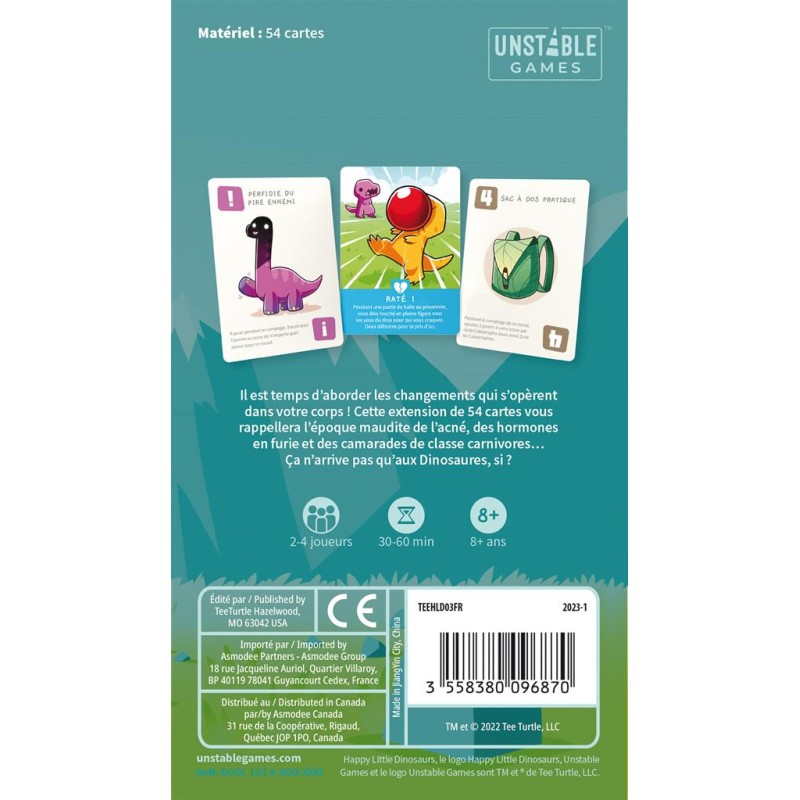 Il est temps d’aborder les changements qui s’opèrent dans votre corps. Cette extension de 54 cartes vous rappellera l’époque maudite de l’acné, des hormones en furie et des camarades de classe carnivores… Lapin enragé, Frelons super meurtriers, Dinos carnivores affamés, Harcèlement méprisable, Survoltage, autant de nouvelles cartes pour semer encore plus de chaos !