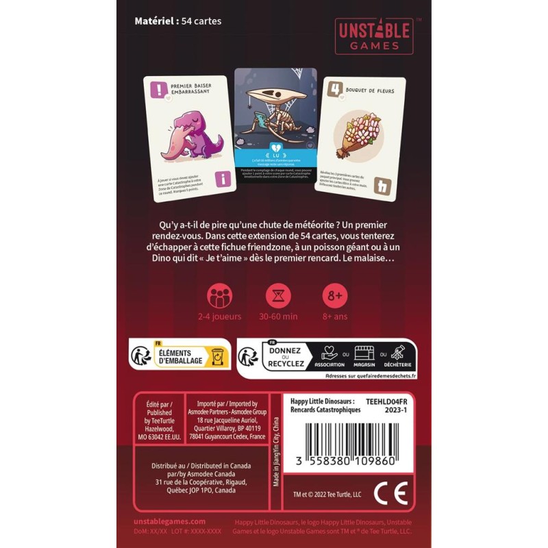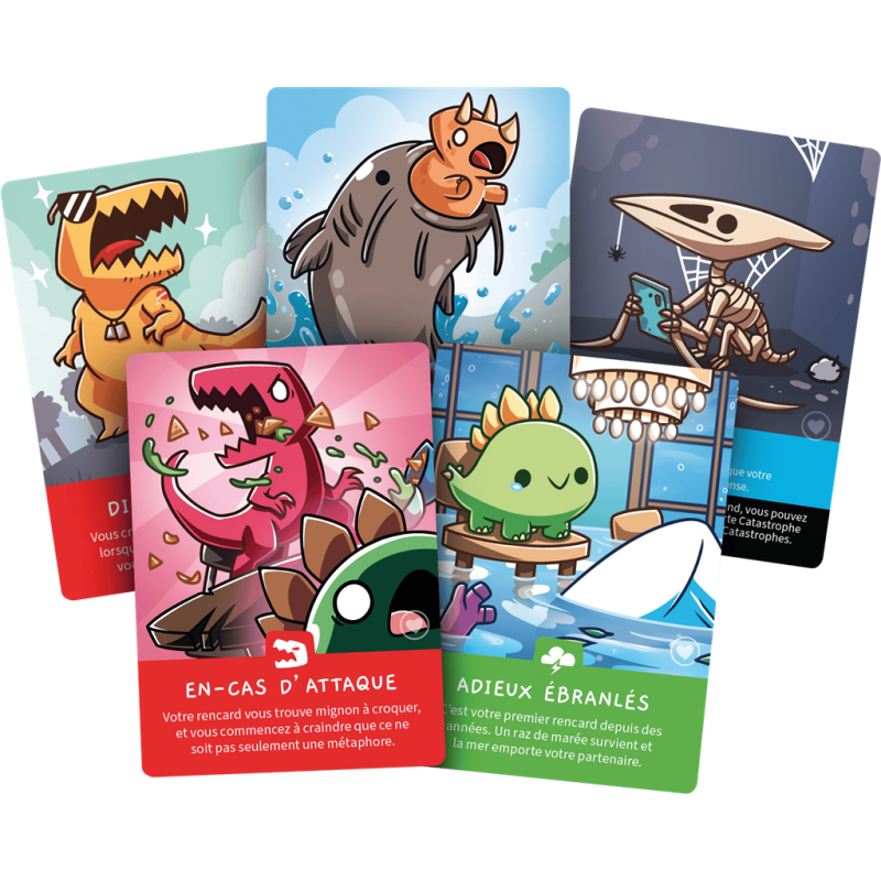 Y’a-t-il quelque chose de pire qu’un météore qui tombe ? Un premier rendez-vous peut-être. Ce c’est que vous propose l’extension Rencards Catastrophiques. Dans ce pack de 54 cartes, vous pourrez éviter la redoutable friendzone, rencontrer un poisson-chat géant ou sortir avec un dino qui vous dit « je t’aime » bien trop tôt. Embarrassant... Pourrez-vous survivre ?