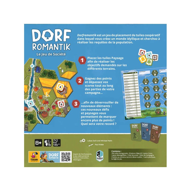 Le décompte final des points s'établit selon les lignes de chemins de fer les plus longues, les cours d'eau les plus majestueux, les différents terrains et les objectifs brillamment atteints. Dorfromantik propose également une dimension de campagne, où les scores obtenus débloquent un contenu additionnel captivant : nouvelles tuiles, cartes inédites, pions spéciaux, et bien plus encore. Chaque partie est une opportunité de perfectionner votre stratégie et de vous surpasser.