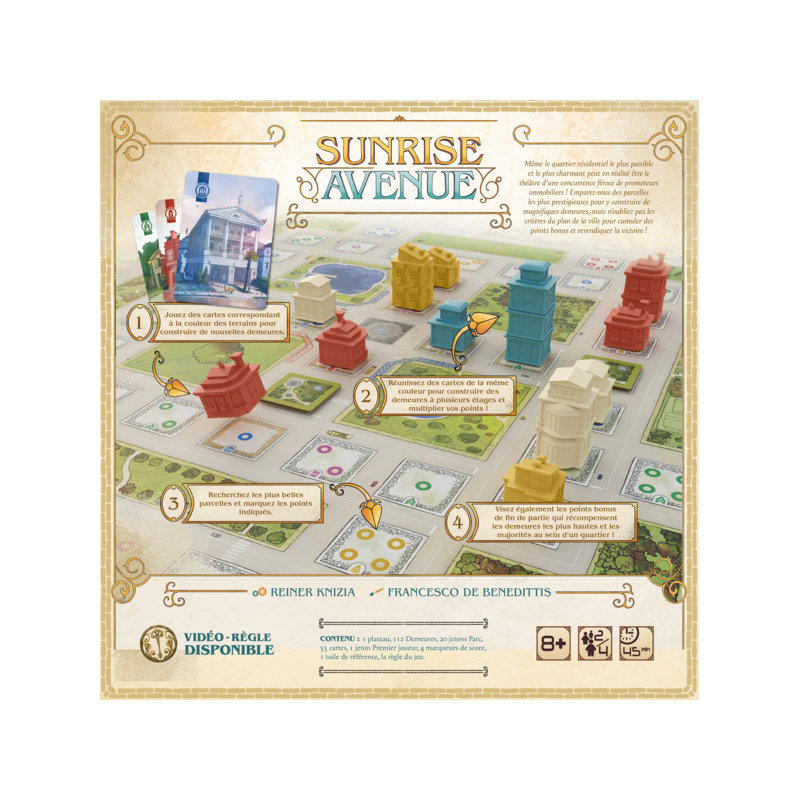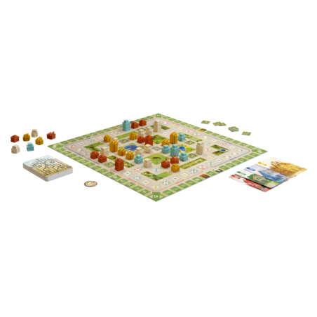 Une concurrence immobilière insoupçonnée fait rage au sein de ce joli quartier résidentiel ! Construisez vos demeures sur les parcelles les plus prestigieuses mais n’oubliez pas les critères du plan de la ville pour cumuler des points bonus et remporter la victoire !