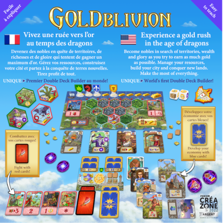 GOLDblivion est un jeu de cartes compétitif dans lequel 1 à 4 joueurs tentent de gagner plus de lingots d’or que leurs adversaires. Vous incarnez les nobles d’une colonie qui s’affrontent en richesse pour devenir Monarque de GOLDblivion! À l’aide d’une mécanique de Double-Deck-Building, construisez votre cité, dirigez vos alliés et partez à la conquête de terres nouvelles avec votre armée. Tirez profit de tout ce que vous pouvez !