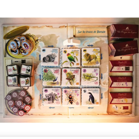 Placez le plateau Voyage au centre de la table, et disposez les tuiles de manière accessible sur les emplacements adéquats. Chaque joueur reçoit un carnet de Naturaliste et une Théorie octroyant des points bonus en fin de partie. Chaque naturaliste prend également un jeton Guide.