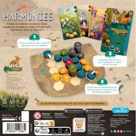 Construisez un paysage sur votre plateau en posant des séries de 3 pions et faites apparaitre des forêts, des montagnes, des champs et des villes. Sélectionnez ensuite les bonnes cartes Animal et reproduisez leur habitats pour qu’ils viennent peupler votre région. Qui obtiendra la plus belle faune ?
