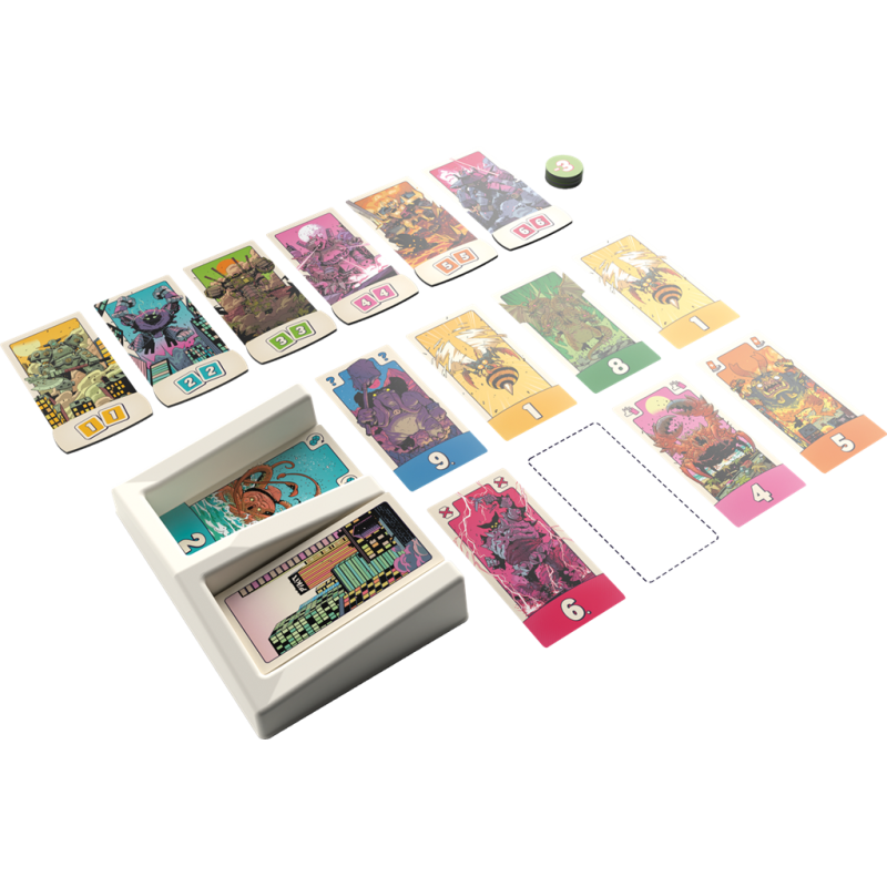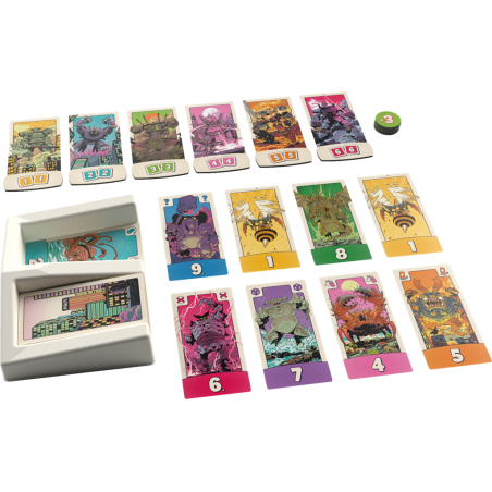 Ensuite, faites l’acquisition de nouvelles cartes selon les résultats obtenus aux dés : carte de même valeur que chaque dé, que leur total ou que leur différence. Vous avez un double ! L’occasion de récupérer l’un des puissants Mecha ou de tenter de le voler à vos adversaires.