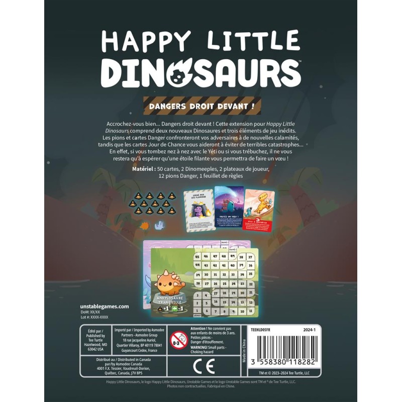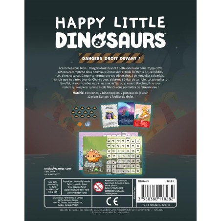 Accrochez-vous bien ... Dangers droit devant ! Cette extension pour Happy Little Dinosaurs comprend deux nouveaux Dinosaures et trois éléments de jeu inédits.