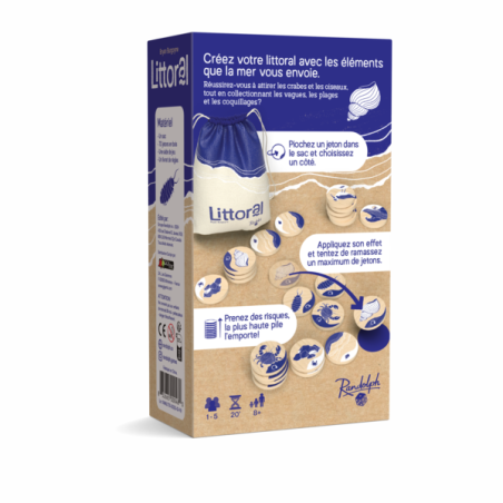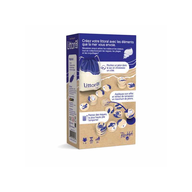 Dans ce jeu, les participants sont invités à récupérer des éléments que la mer apporte sur la plage pour créer la plus grande pile d’éléments possible. Avec des règles simples, Littoral promet des parties rapides et intenses, où chaque joueur doit piocher des jetons dans un sac et décider de leur placement pour maximiser leurs points. Le jeu se distingue par son aspect éducatif, mettant en avant la beauté et la fragilité de la nature côtière.
