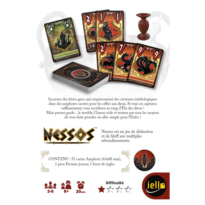 Dans Nessos, incarnez des héros grecs qui emprisonnent des créatures mythologiques dans des amphores sacrées pour les offrir aux dieux. Si vous en capturez suffisamment, vous accéderez au rang d’Élu des dieux ! Mais prenez garde...le terrible Charon rôde et tentera par tous les moyens de vous faire prendre un aller simple pour l’Enfer ! Principe du jeu : Tout au long de la partie, les joueurs doivent bluffer pour obtenir les cartes Amphore représentant les Créatures les plus intéressantes. À votre tour, orez une Amphore à un autre joueur. Celui-ci peut soit l’accepter, soit la refuser en la proposant à un autre joueur. Récoltez ainsi les Amphores afin d’être le premier à atteindre le nombre de points nécessaire. Mais attention, si vous obtenez trois cartes Charon, vous perdez la partie.