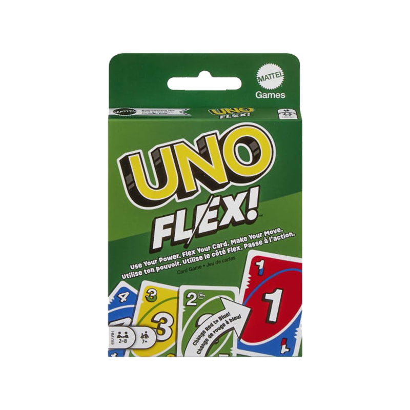 Le jeu de cartes UNO Flex est basé sur le jeu de cartes UNO que tous les joueurs connaissent et apprécient, mais offre plus de flexibilité. Des cartes spéciales permettent aux joueurs de changer la couleur d’une carte pour pouvoir jouer : un 4 rouge peut devenir un 4 vert grâce à un « flex ». Les cartes Pouvoir et les cartes Action Flex ajoutent encore plus de rebondissements au jeu !