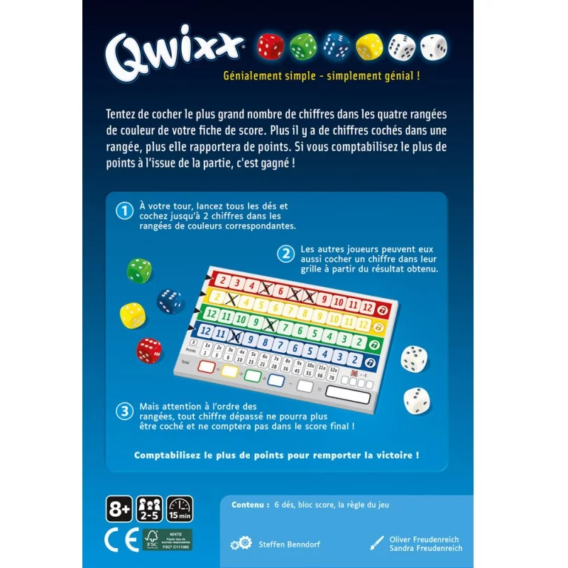 Avec Qwixx, impossible de s’ennuyer : à son tour, chaque joueur lance les dés et tout le monde peut utiliser le résultat pour cocher un chiffre d’une de ses rangées. Plus vous cochez de cases, plus vous marquez de points. Mais attention, les chiffres sont classés dans un certain ordre et une fois que vous en avez passé impossible de revenir en arrière. Laissez-vous emporter par la simplicité de ce jeu de dés palpitant !